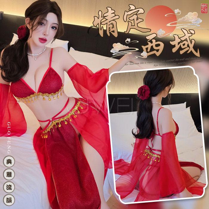 情定西域.異域風情復古亮片拼接裙擺角色扮演服-紅色【胸罩+短裙+T褲+袖子*2】
