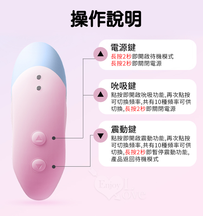 * 外吸內震,雙向挑逗,欲罷不能 * 10頻率精準吮吸,包裹刺激敏感 * U型人體工學設計,自然貼合 * 多種玩法刺激,嗨潮不斷 * 安心柔軟材質,守護私處 * 磁吸充電 * 充電時間:約2小時 * 使用時間:約1小時