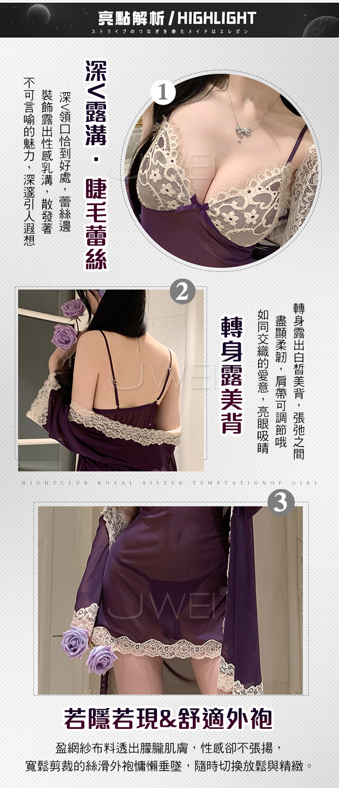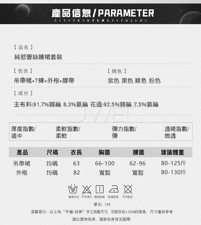 ■內容物:吊帶裙+T褲+外袍+腰帶 ■適穿尺寸:FREESIZE ■彈性:彈 ■未撐開平量尺寸正負誤差1~2cm,1吋=2.54cm ■注意事項:基於保障消費者個人衛生,此貼身衣物恕不接受退換貨。 (如為商品本身暇疵,接受七日內換貨,請勿試穿,謝謝您)