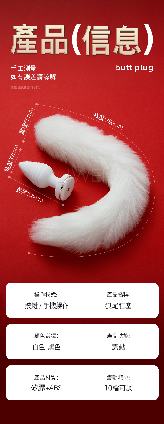 百變狐娘震動狐尾肛塞,體驗另類性愛 增進情趣~ 十頻震動肛塞,震動調情柔順尾毛 APP内置多種玩法模式,遠端調情 ■尺寸:大小詳如圖片標示 ■材質:矽膠+ABS ■功能:10頻震動、加溫