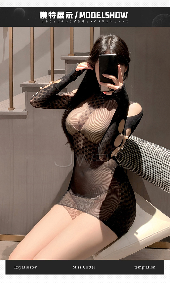 鄰家姐姐.高智感珍珠飾側鏤空長袖半高領包臀連身網衣-黑【單件網衣】