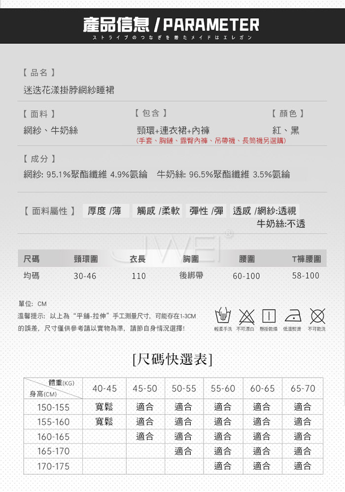■內容物:頸環+連衣裙+內褲 ■適穿尺寸:FREESIZE ■彈性:彈 ■未撐開平量尺寸正負誤差1~2cm,1吋=2.54cm ■注意事項:基於保障消費者個人衛生,此貼身衣物恕不接受退換貨。 (如為商品本身暇疵,接受七日內換貨,請勿試穿,謝謝您)