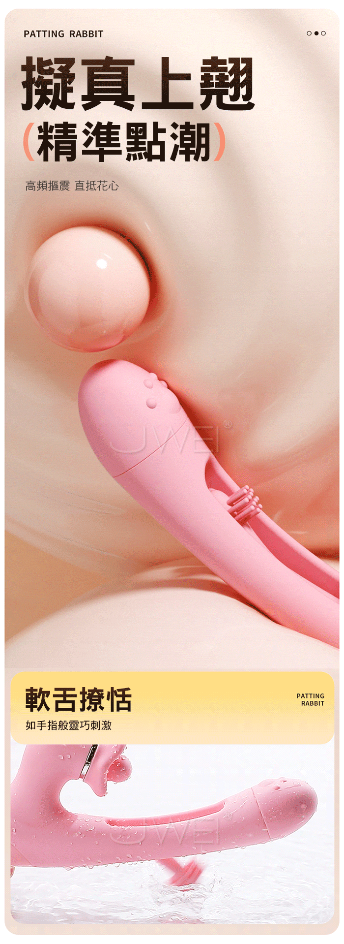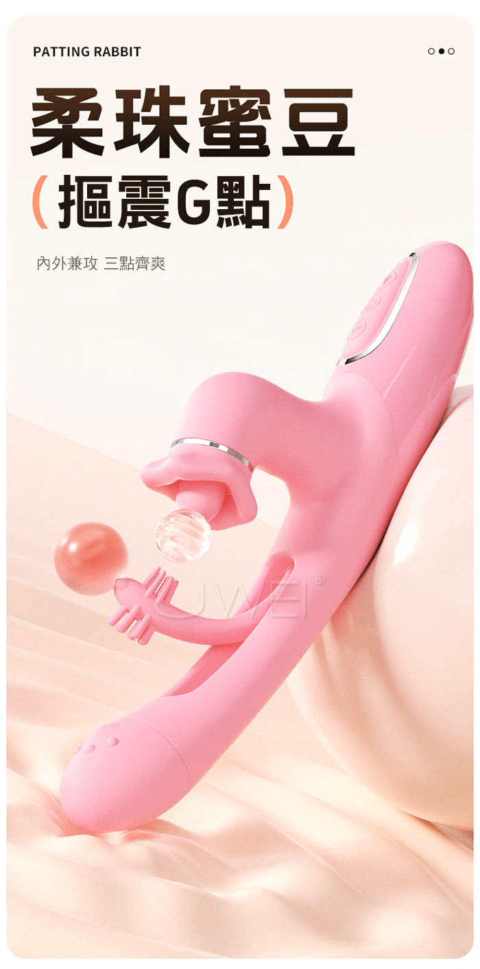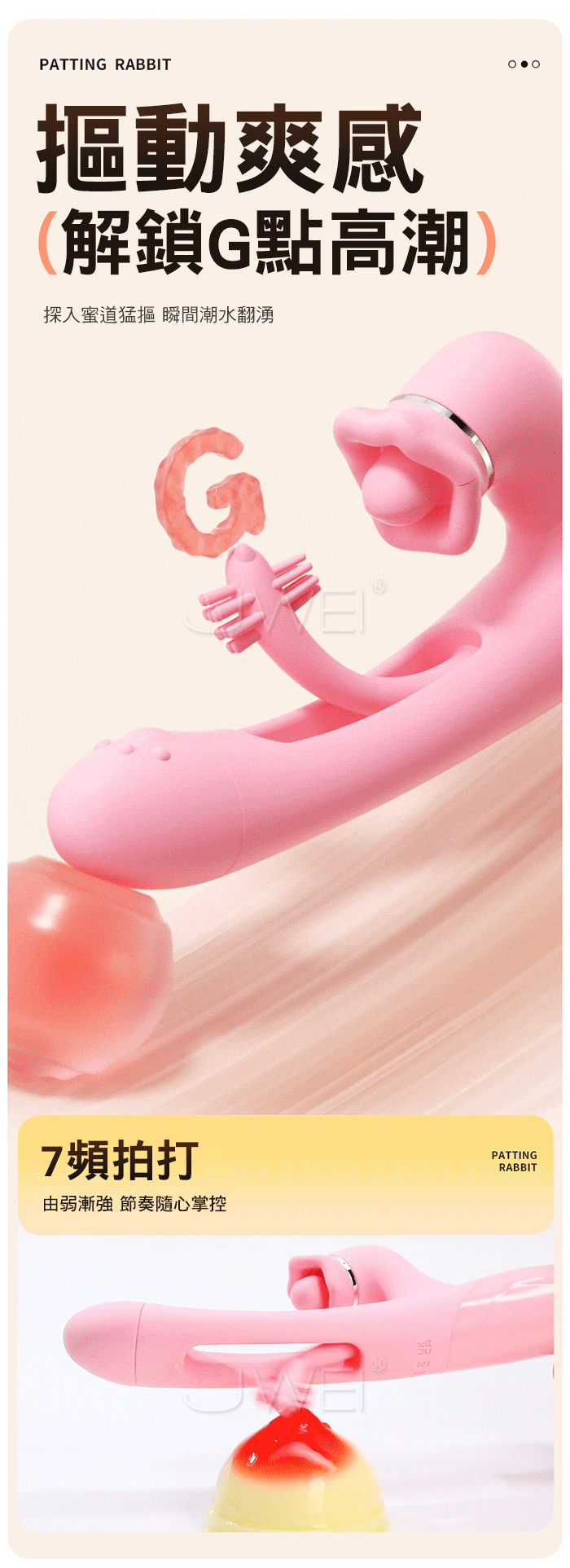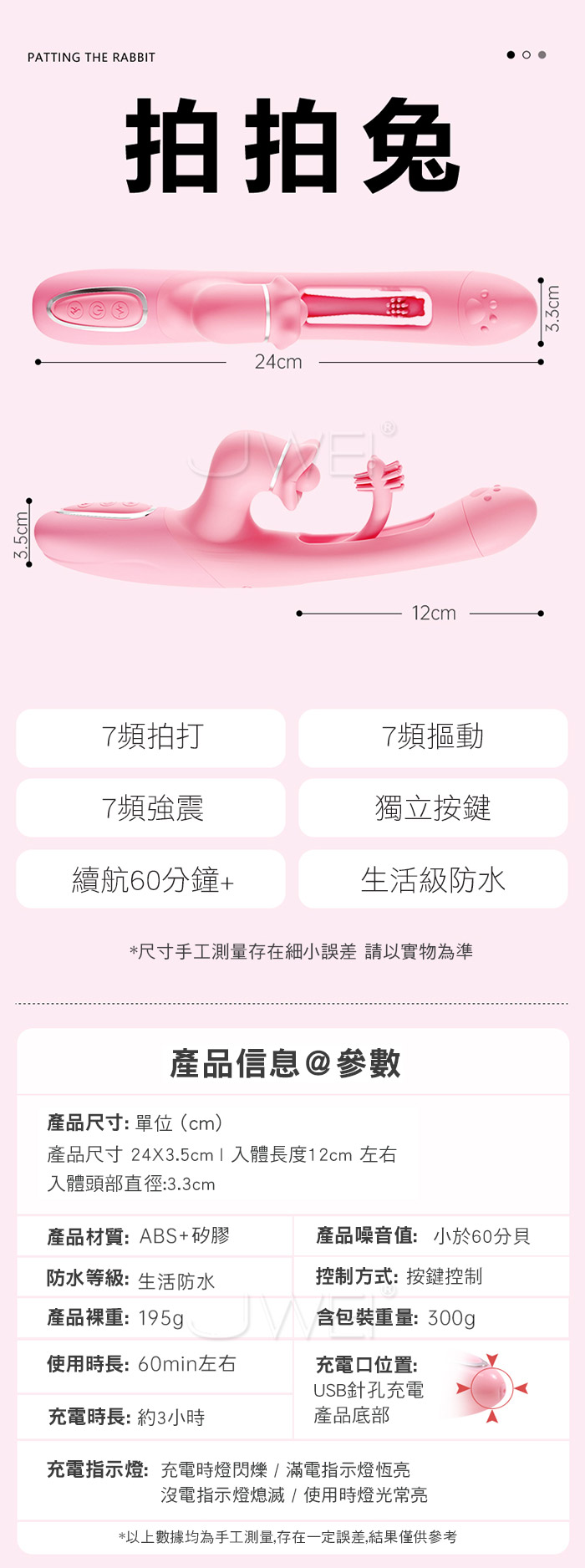 爽過手摳,拍拍兔摳震拍打棒,伸進去 誰能頂得住! 摳動爽感,解鎖G點高潮,探入蜜道猛摳 瞬間潮水翻湧 柔珠口愛,拍震撩撥C點,你的小豆豆 一抵住就失控 脉衝激震,頂震A點,穿透式震動 酥麻整個密道 產品規格 ■材質: 矽膠+ABS ■規格: 詳如圖片標示 ■功能: 7頻拍打、7頻強震、7頻摳動