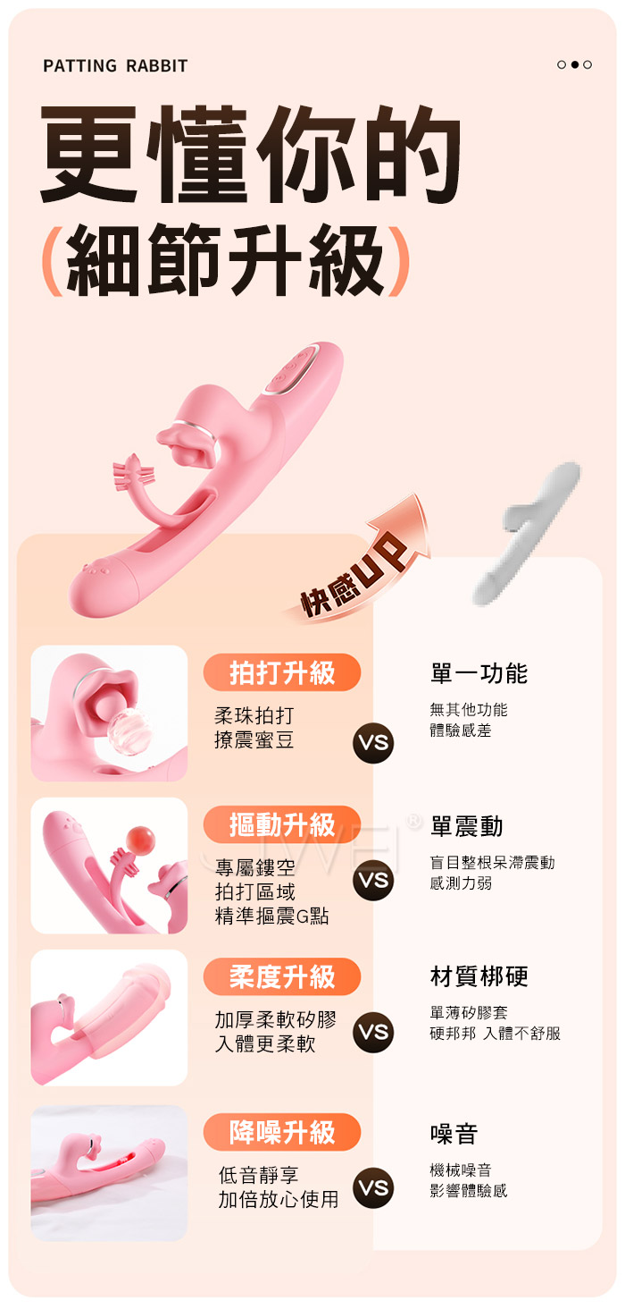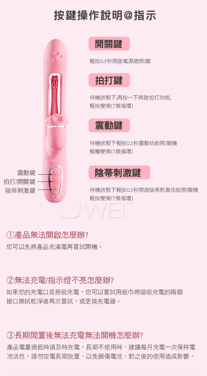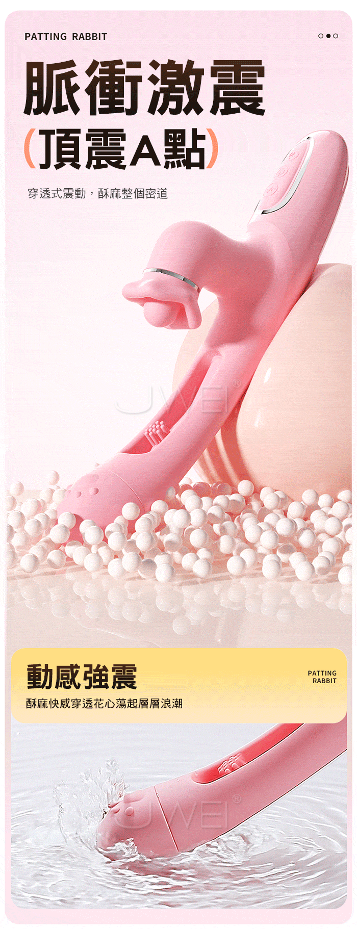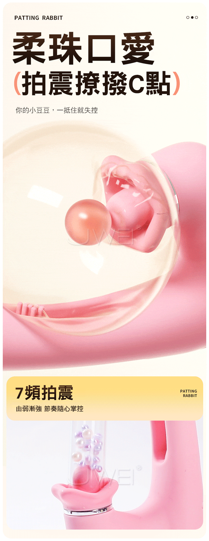 爽過手摳,拍拍兔摳震拍打棒,伸進去 誰能頂得住! 摳動爽感,解鎖G點高潮,探入蜜道猛摳 瞬間潮水翻湧 柔珠口愛,拍震撩撥C點,你的小豆豆 一抵住就失控 脉衝激震,頂震A點,穿透式震動 酥麻整個密道 產品規格 ■材質: 矽膠+ABS ■規格: 詳如圖片標示 ■功能: 7頻拍打、7頻強震、7頻摳動