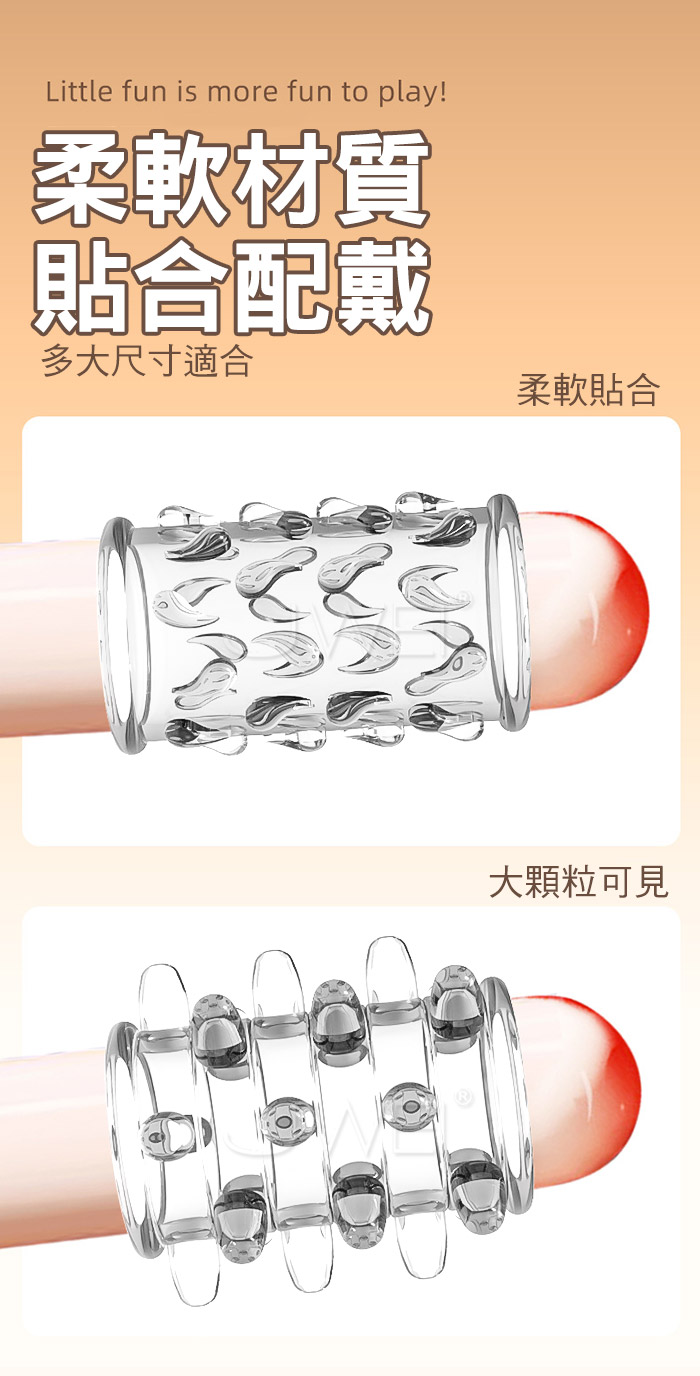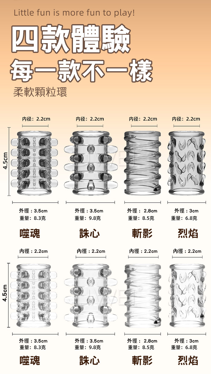 入珠纏綿露頭設計鎖精高潮環,鎖精、長時、加強,大顆粒柔軟材質,顆粒密集大狼牙套 直入深處波濤洶湧,漫漫長夜裡有她跟他一起是一種浪漫溫馨的時刻 這時候戴來一點不同,整個長夜餘韻悠長,帶她進入新的領域遨遊! ■材質:TPE ■功能:加粗變大,顆粒刺激,鎖精延時 ■內容:4入裝