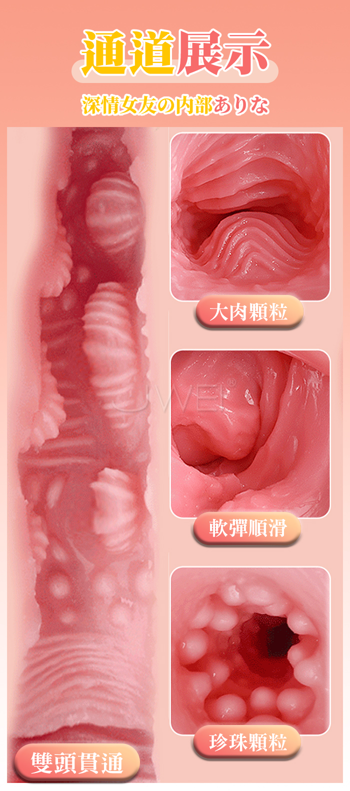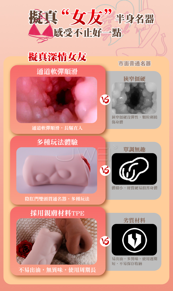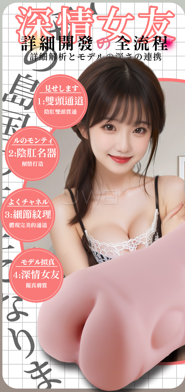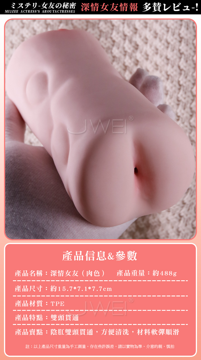 突如其來的性感 深情黏系の女友 更軟、更彈、更貼合 擬真紋理,飽滿緊緻相較於其他名器外陰做的更加飽滿 比市面普通名器更加擬真,同時設計成雙頭貫通。 產品規格 ■尺寸:大小詳如圖片標示 ■材質:TPE ■重量:約488g ■特點:雙頭貫通