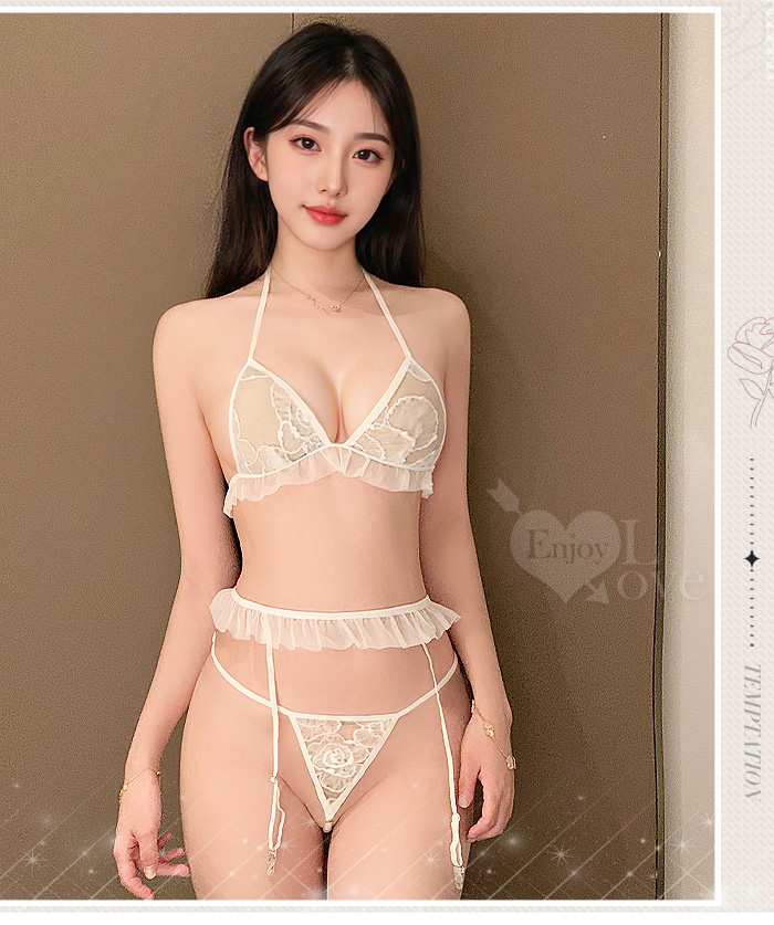 | 「法式透紗」蕾絲比基尼 × 花邊吊襪帶 × 串珠丁字褲 夢幻四件式套裝
