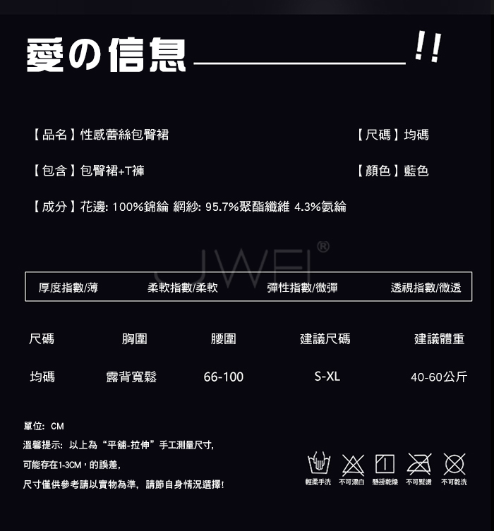 ■內容物:包臀裙+T褲 ■適穿尺寸:FREESIZE ■彈性:微彈 ■未撐開平量尺寸正負誤差1~2cm,1吋=2.54cm ■注意事項:基於保障消費者個人衛生,此貼身衣物恕不接受退換貨。 (如為商品本身暇疵,接受七日內換貨,請勿試穿,謝謝您)