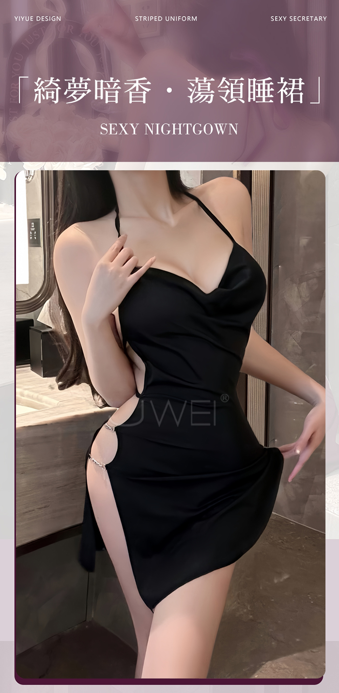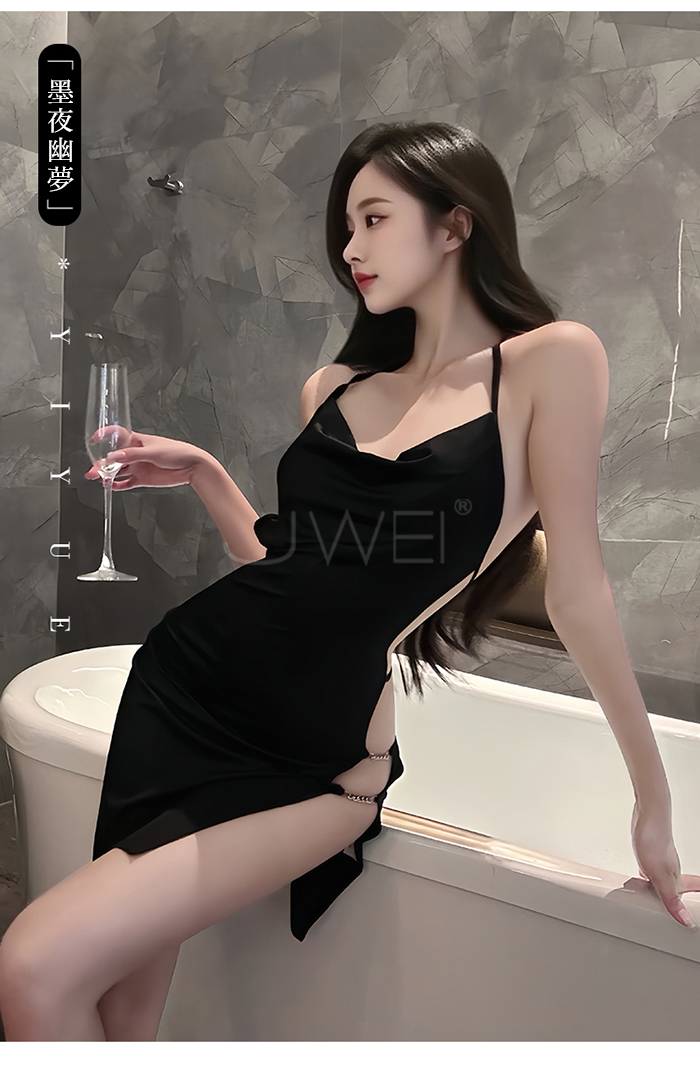 | 綺夢暗香.優雅蕩領美背綴腰掛脖後繫帶睡裙【黑色】