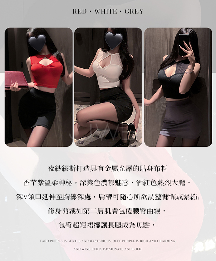 ►您現在的位置:首頁>繆斯秘語.胸前挖空露溝貼身包臀超短裙擺秘書裝【T褲+紅上衣+黑裙】
