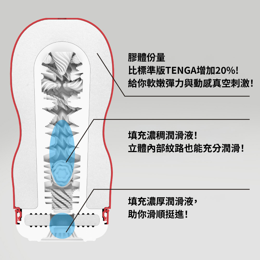 經典TENGA升級版,尺寸略大、膠體份量增加20%,擁有超立體、高密度內部紋路設計,