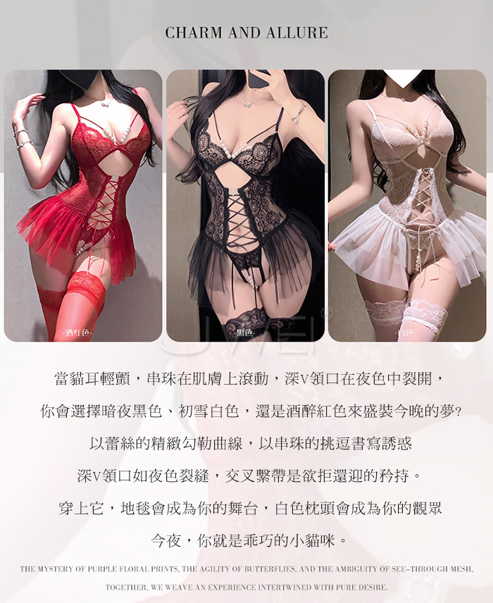 ►您現在的位置:首頁>串珠織夢.深V珍珠飾胸蕾絲繫帶花邊裙擺開襠連體衣【酒紅】