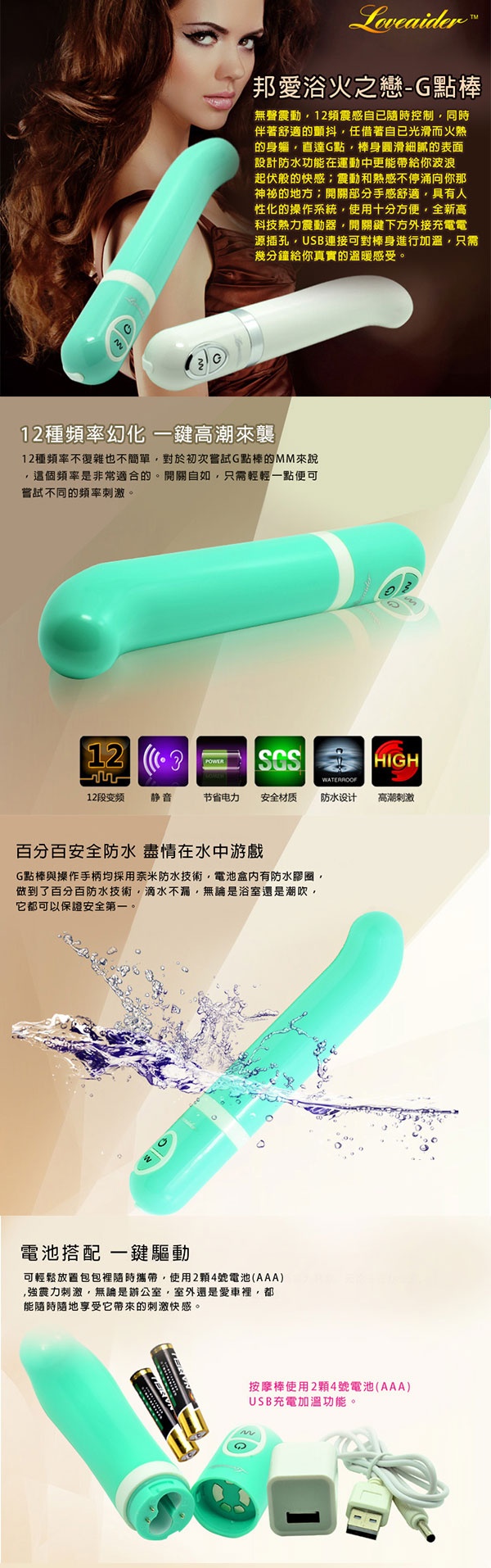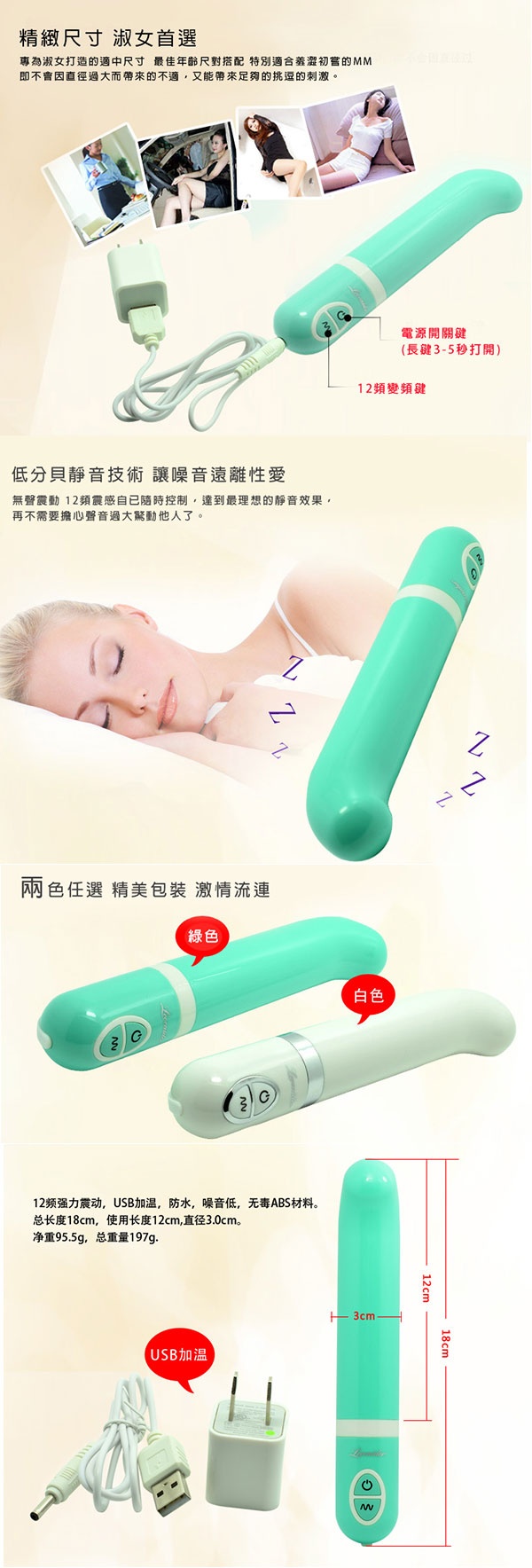 前端彎弧設計刺激G點處,無聲震動,共有12頻震動模式可供自已隨意選擇,細膩光滑的棒身設計,貝有防水功能,讓你不論在何處均能體驗它帶來的快感;最棒的是它具 有加溫設計,棒身只需幾分鐘就能給你真實的溫暖感受,同時體驗震動和 熱感湧向你那神祕的地方,開啟一場驚艷之旅吧! ■規格:如圖所示 ■材質:ABS材質 ■電池:2顆4號電池 USB充電式加溫 ■顏色:綠
