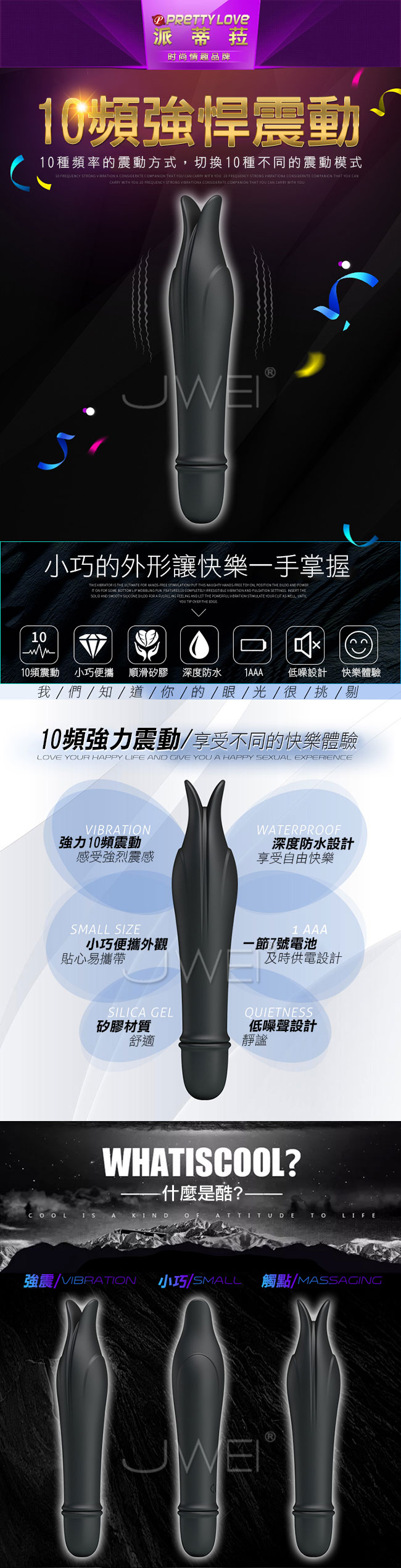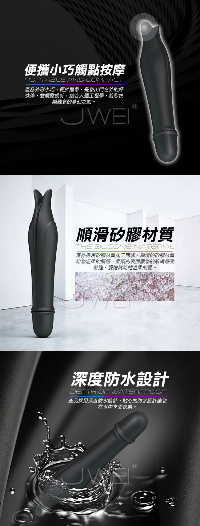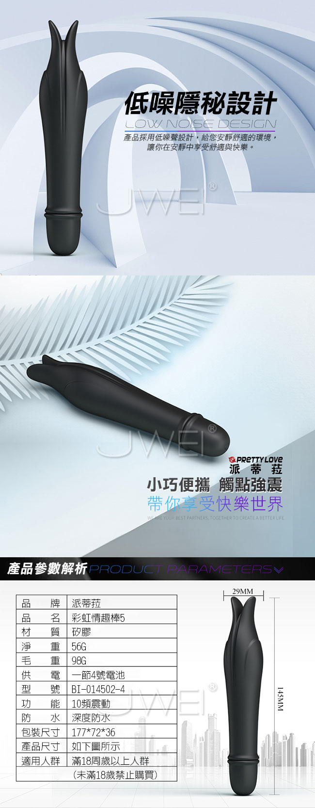 ■尺寸:詳如圖片所示 ■材質:矽膠 ■供電:1節4號電池 ■10段變頻 ■觸點雙震 ■深度防水 ■靜音低噪