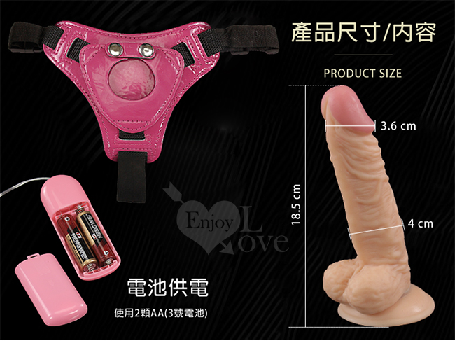 女同志專用穿載式震動型按摩棒,乳膠材質製,軟Q而不過於生硬,給妳們的性生活更增添樂趣。 在陰莖上內置一個震動器,使用控制器旋鈕可微調控制震動強弱,輕輕鬆鬆讓另一伴享受高潮快感。 ※ 規格:詳如圖 ※ 顏色:肉色 ※ 適用電池3號*2顆 ※ 本款可調整最大穿至34吋腰圍 ※ 此產品詳細樣式如圖所攝錄,敬請參閱選購