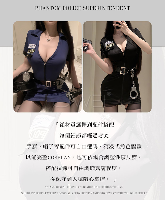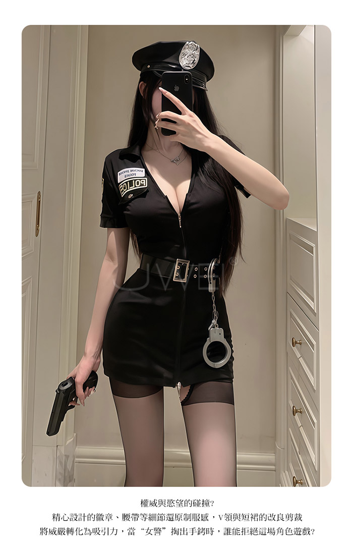 魅影警司.制惑拉鍊調節開胸性感貼身包臀女警套裝-黑色【連身褲裙+皮帶+手銬】