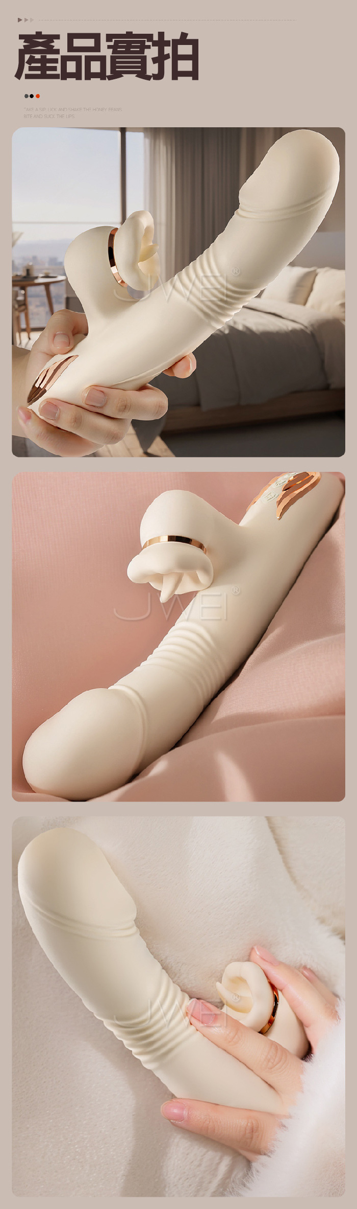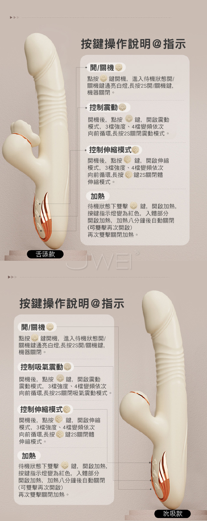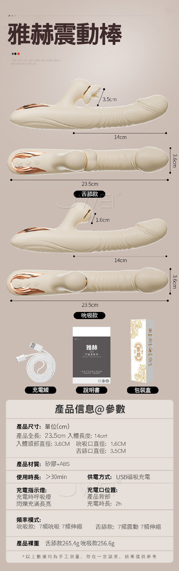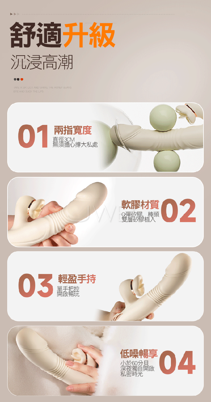 伸縮舌舔,快感漣漪,在強勁的動感中深入,刺激蜜豆 獲取潮湧 螺紋刺激,環繞摩擦,激發快感高潮措手不及 強勁伸縮,高頻沖擊拒絕卡頓,不僅僅是速度與激情的碰撞,更是引爆沖擊快感 ■尺寸:大小詳如圖片標示 ■材質:矽膠、ABS ■供電:USB充電 ■特色:7頻舌舔震動、7頻伸縮、加溫