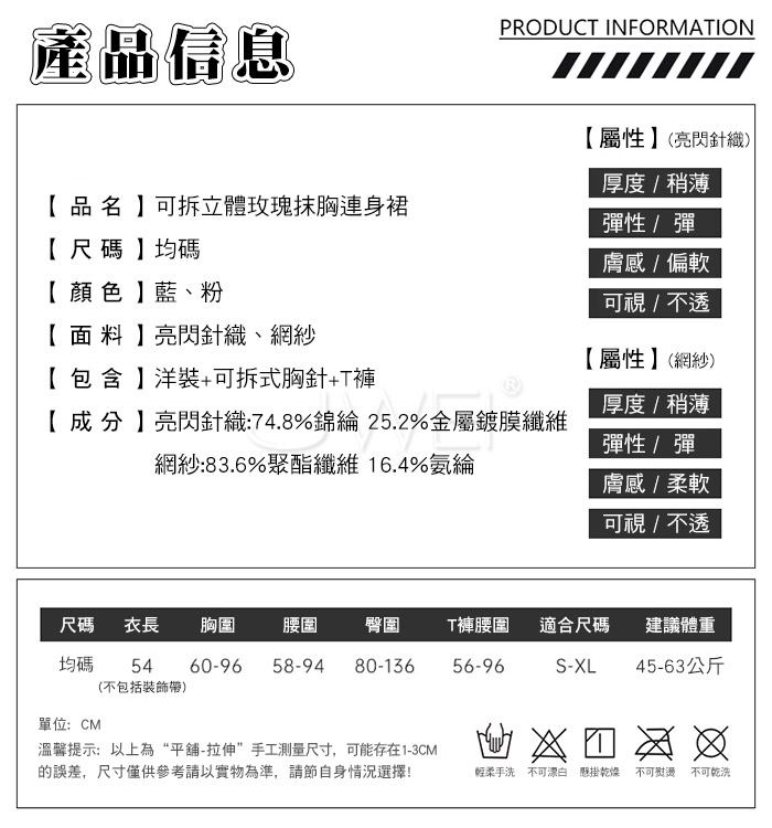 ■內容物:連衣裙+可拆式胸針+T褲 ■適穿尺寸:FREESIZE ■彈性:彈 ■未撐開平量尺寸正負誤差1~2cm,1吋=2.54cm ■注意事項:基於保障消費者個人衛生,此貼身衣物恕不接受退換貨。 (如為商品本身暇疵,接受七日內換貨,請勿試穿,謝謝您)