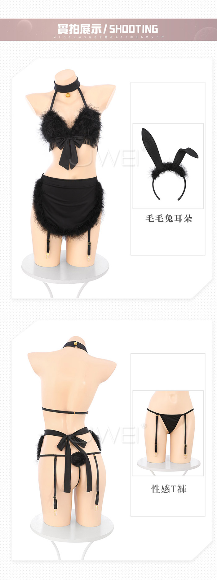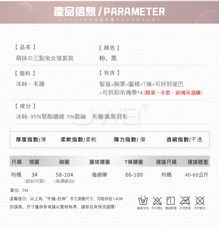 ■內容物:髮箍+胸罩+圍裙+T褲+可拆卸尾巴+可拆卸吊襪帶*4 ■適穿尺寸:FREESIZE ■彈性:彈 ■未撐開平量尺寸正負誤差1~2cm,1吋=2.54cm ■注意事項:基於保障消費者個人衛生,此貼身衣物恕不接受退換貨。 (如為商品本身暇疵,接受七日內換貨,請勿試穿,謝謝您)