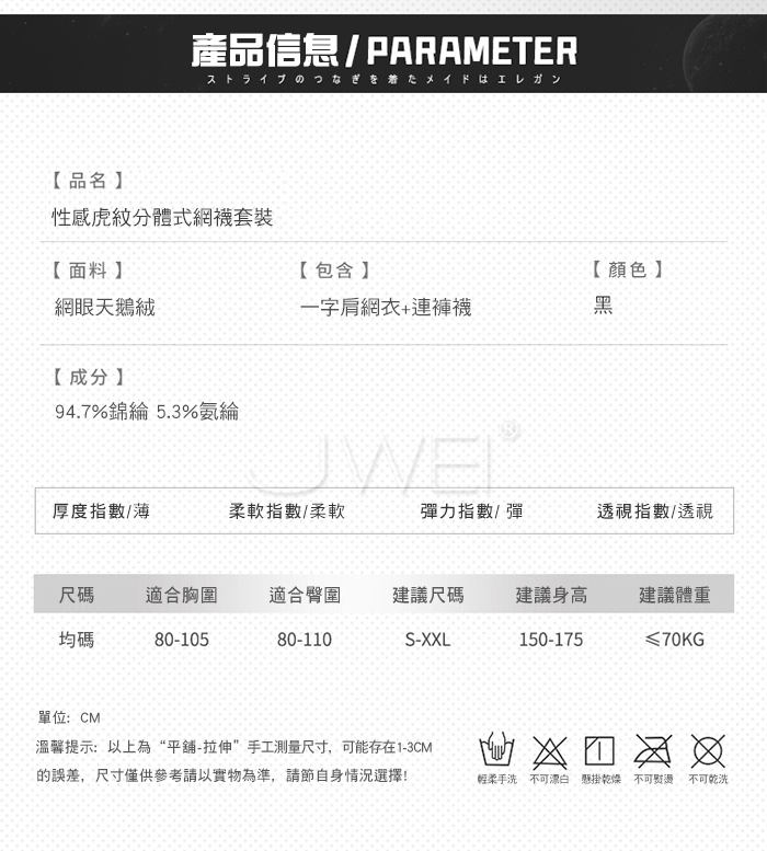 ■內容物:一字肩網衣+連褲襪 ■適穿尺寸:FREESIZE ■彈性:彈 ■未撐開平量尺寸正負誤差1~2cm,1吋=2.54cm ■注意事項:基於保障消費者個人衛生,此貼身衣物恕不接受退換貨。 (如為商品本身暇疵,接受七日內換貨,請勿試穿,謝謝您)
