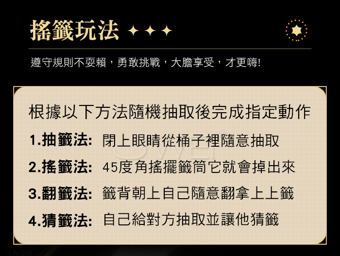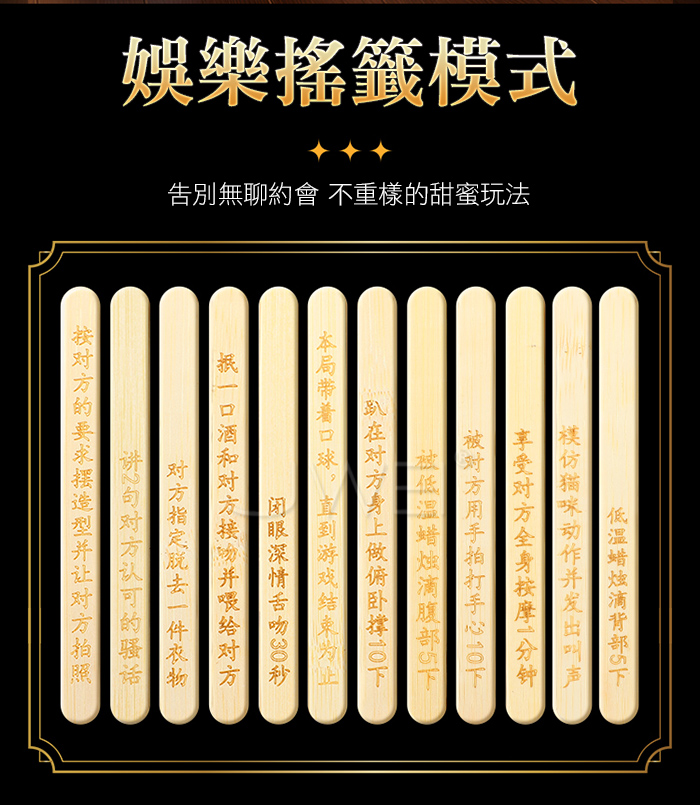 娛樂搖籤模式,告別無聊約會 不重樣的甜蜜玩法 沉默終結者上線,用随機任務打破僵局,氣氛秒升溫 拒絕尷尬沉默,每簽都是親密催化劑 產品規格 ■材質: 竹 ■規格: 詳情如圖示