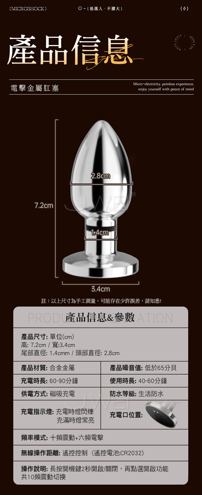 微電擊金屬後庭調教塞,微電不痛 安心玩 六頻電擊,越玩越想玩,微電流刺激,直擊深處敏感點 十頻強震,暢享後庭快感,前戲調情 漸入佳境 肆意暢玩! 產品規格 ■材質: 合金金屬 ■規格: 詳如圖片標示 ■功能: 6頻電擊、10頻強震、遙控
