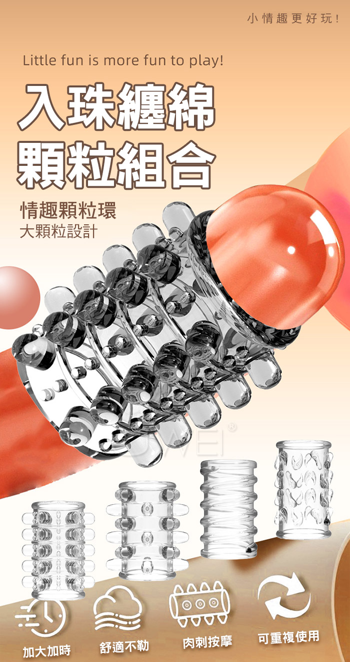 入珠纏綿露頭設計鎖精高潮環,鎖精、長時、加強,大顆粒柔軟材質,顆粒密集大狼牙套 直入深處波濤洶湧,漫漫長夜裡有她跟他一起是一種浪漫溫馨的時刻 這時候戴來一點不同,整個長夜餘韻悠長,帶她進入新的領域遨遊! ■材質:TPE ■功能:加粗變大,顆粒刺激,鎖精延時 ■內容:4入裝