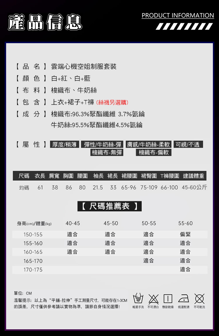 ■內容物:上衣+裙子+T褲 ■適穿尺寸:FREESIZE ■材質:梭織布、牛奶絲 ■牛奶絲彈性:彈,梭織布彈性:無彈 ■未撐開平量尺寸正負誤差1~2cm,1吋=2.54cm ■注意事項:基於保障消費者個人衛生,此貼身衣物恕不接受退換貨。 (如為商品本身暇疵,接受七日內換貨,請勿試穿,謝謝您)