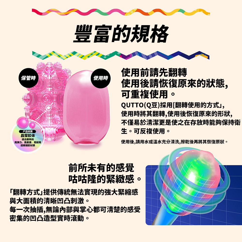使用時,通過將外殼翻轉使大顆粒的凹凸聚集於內!體驗被QUTTO(Q豆)束縛的「未知感觸」