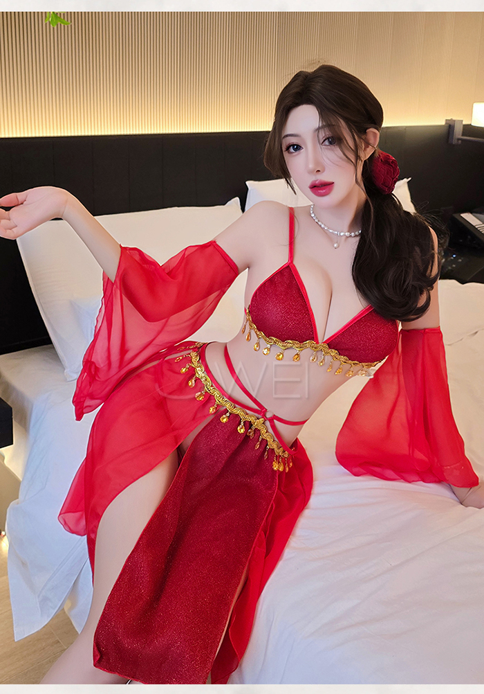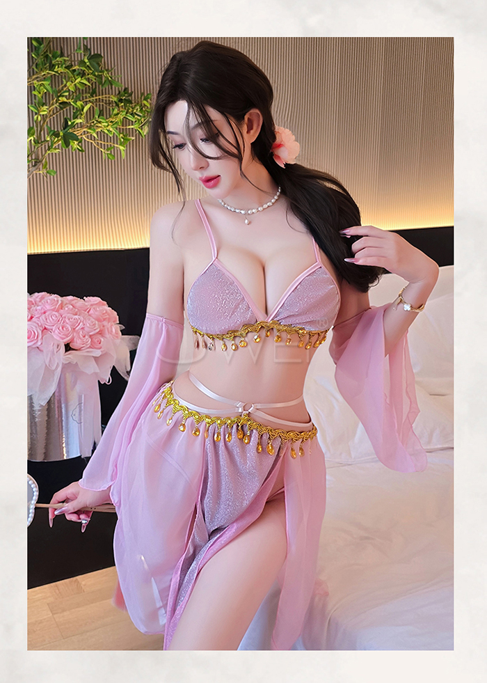 | 情定西域.異域風情復古亮片拼接裙擺角色扮演服-粉色【胸罩+短裙+T褲+袖子*2】